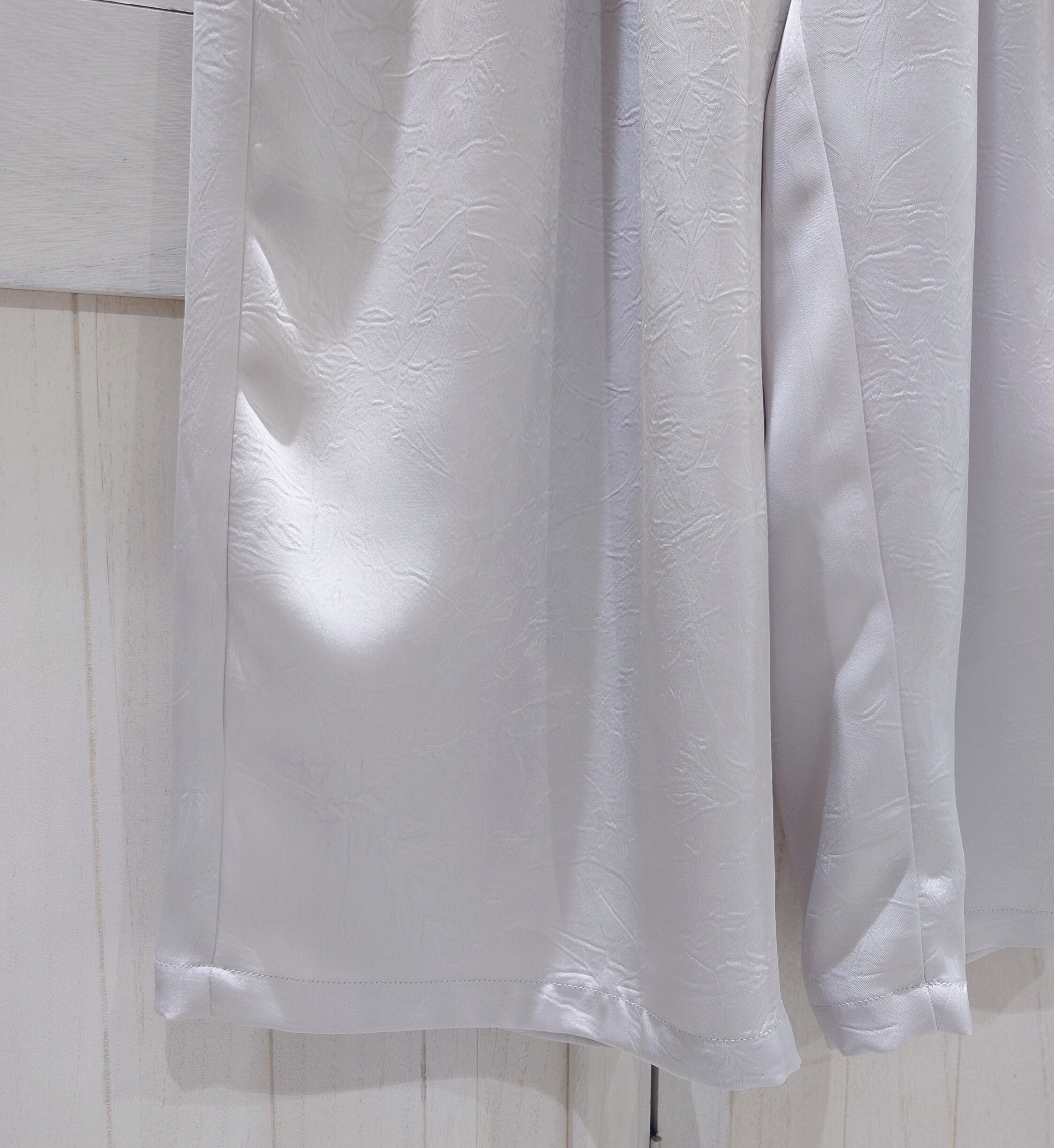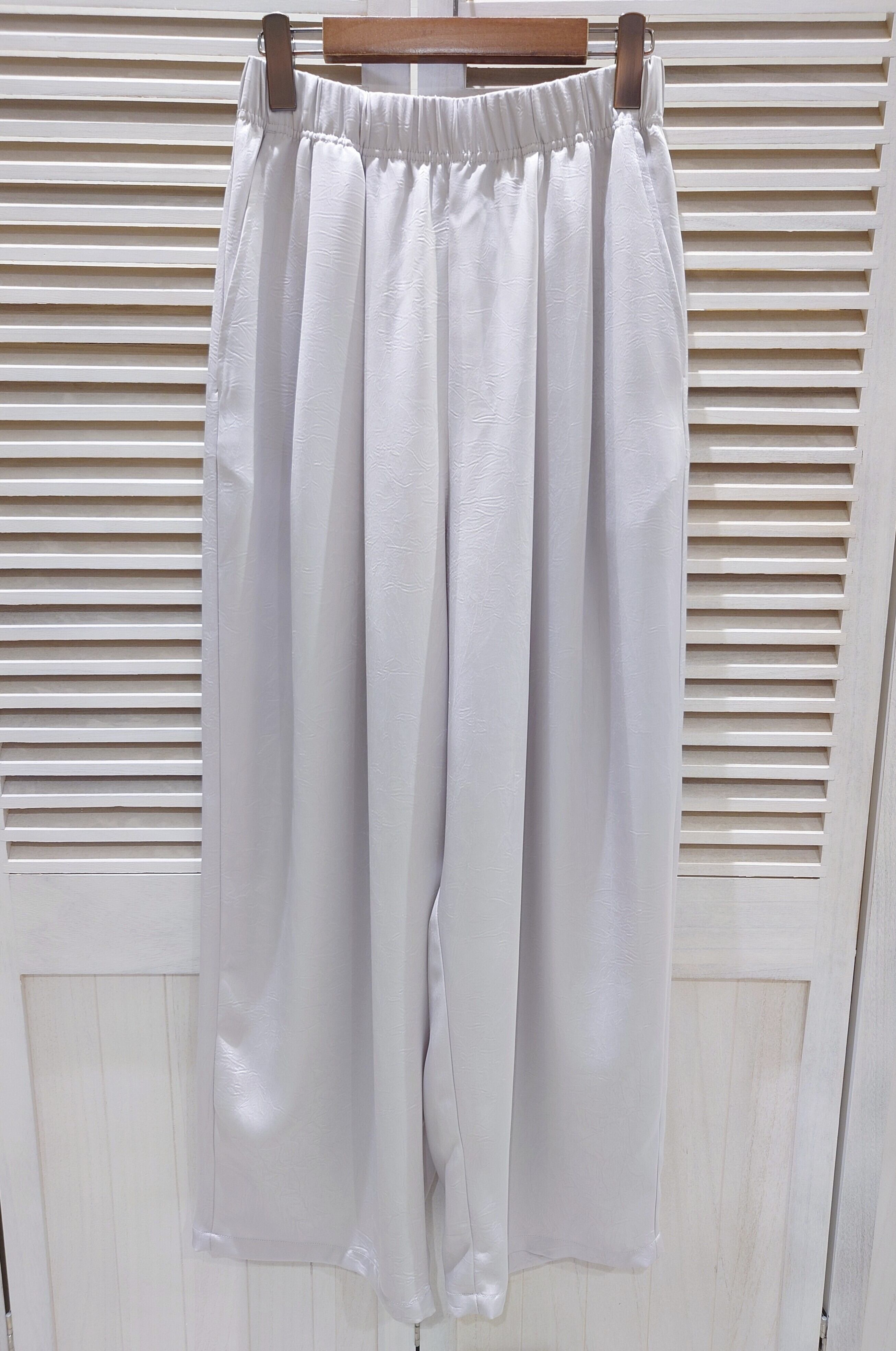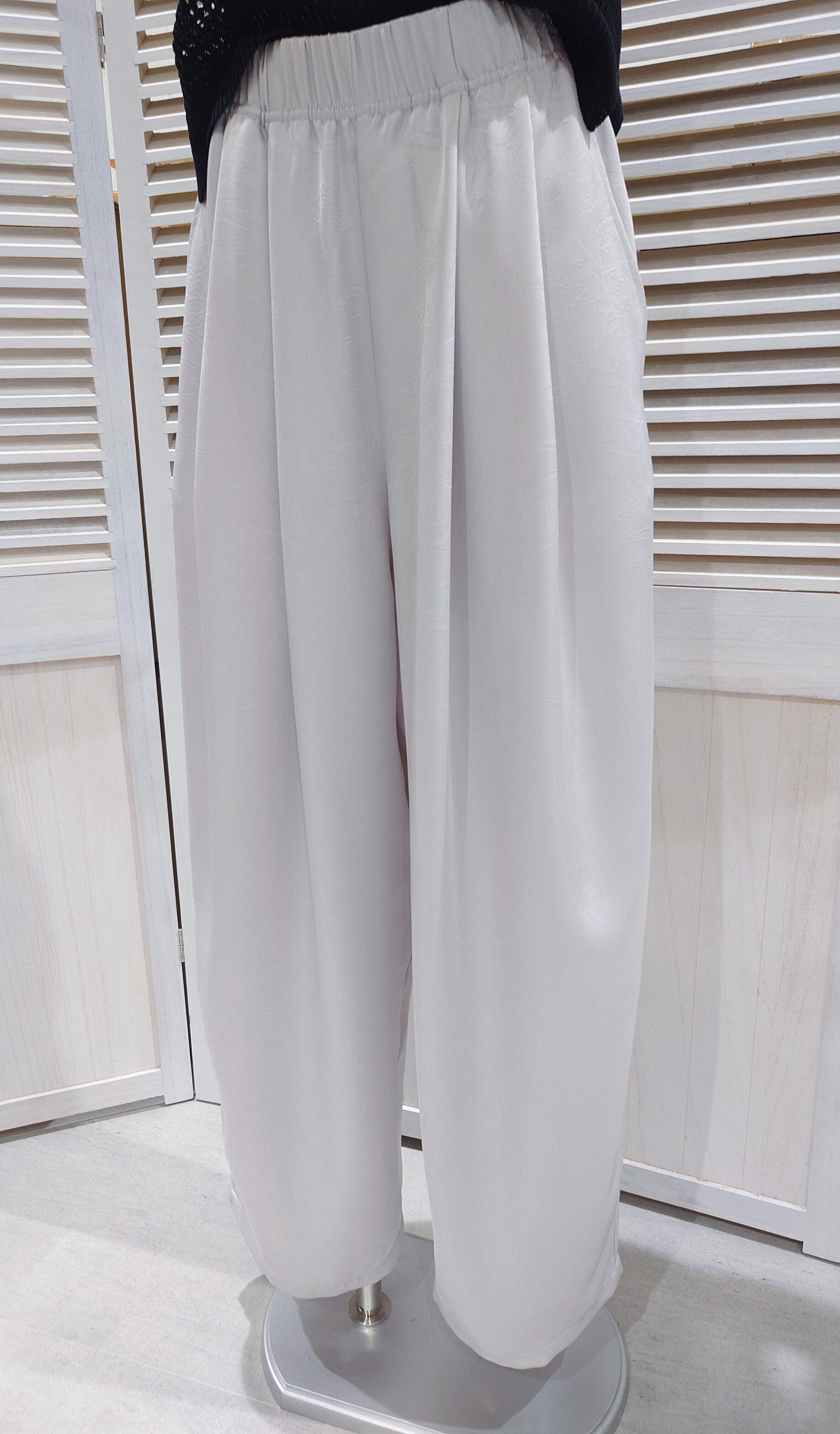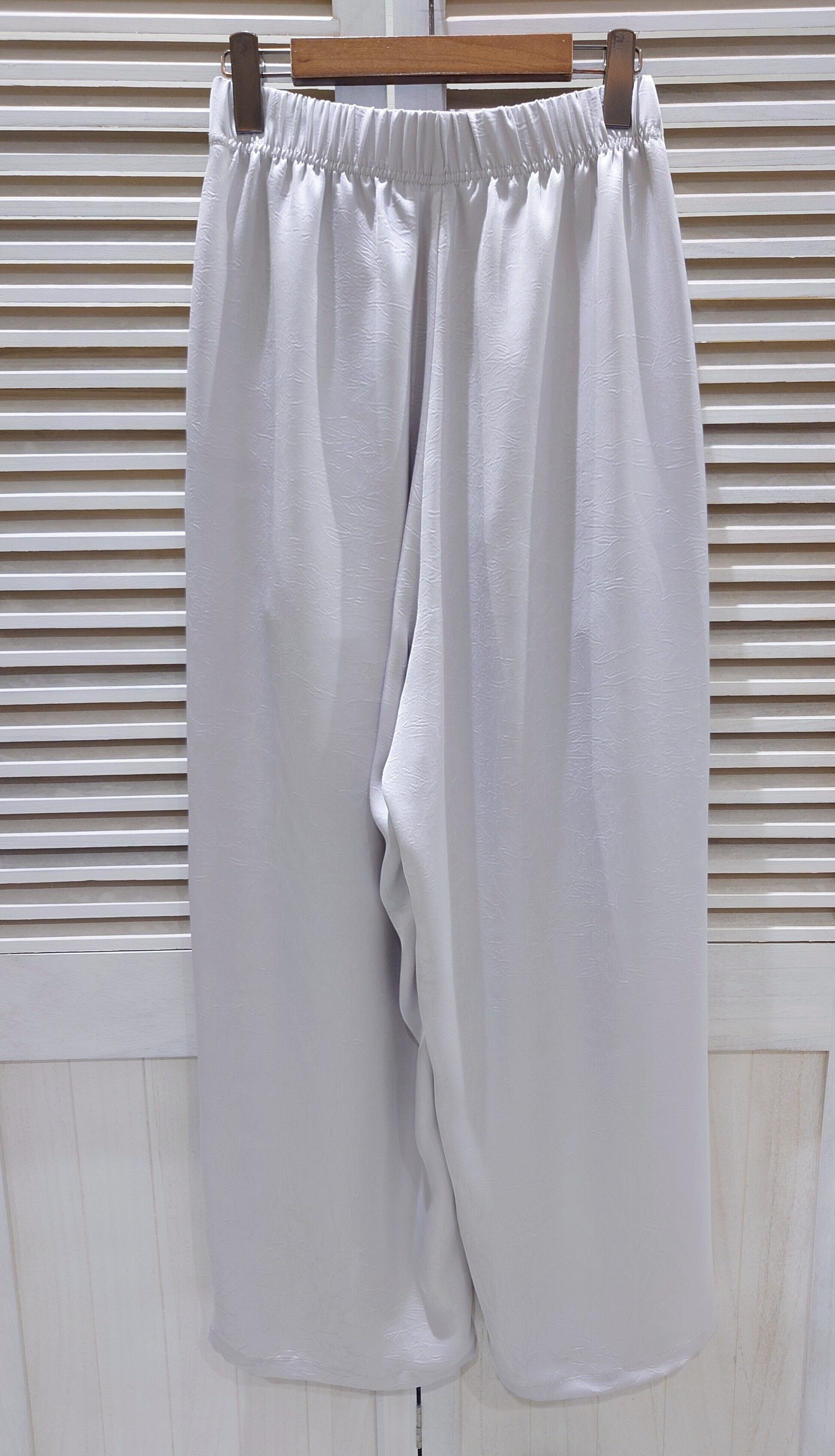 ワッシャー加工が施されたサテン素材のライトグレーのワイドパンツです。