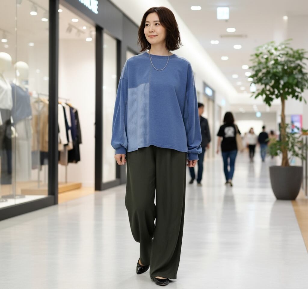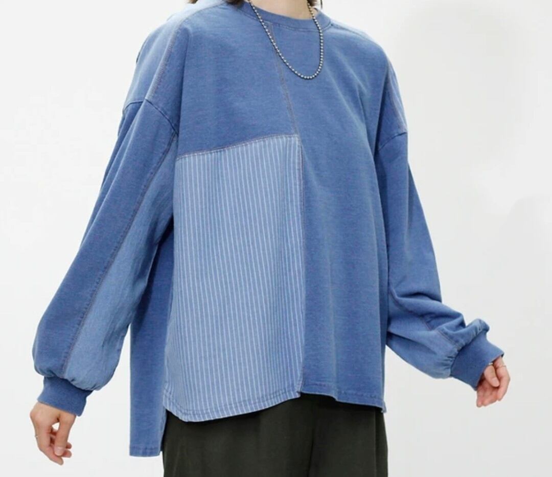 ストライプ柄とデニムの2種類の布帛素材で切り替えたゆるっとしたシルエットとこなれたラウンドヘムで抜け感たっぷり◎