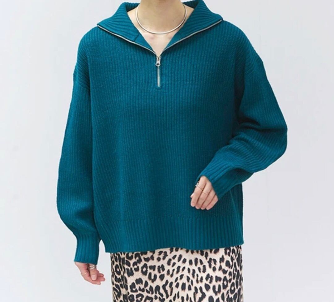 ジップデザインのアクリルバルキーニットプルオーバーです。